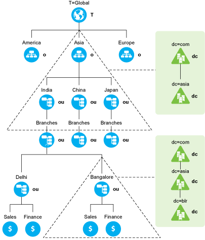 It is also possible to map the partitions underneath O=Asia to a new child domain and skip any levels of containers underneath. Refer Section 5.2.1, Deploying DSfW by Skipping Containers. So, you can map the OU=India partitioned container to create a new child DSfW domain or directly map OU=Delhi or OU=Sales partitioned container.