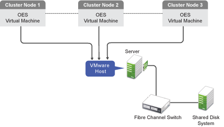 In Figure 3-2, the NCS cluster nodes are all virtual machines. Each node is hosted on the same VMware host. All nodes are running the same version of the OES operating system.