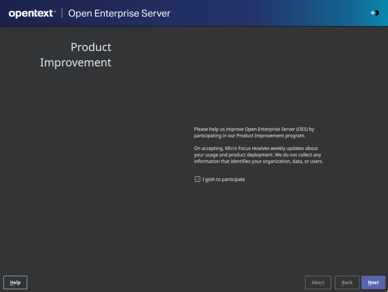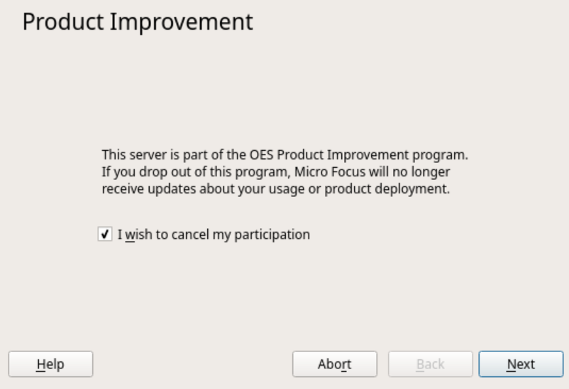 If you do not wish to continue participation, run yast2 oes-improvement on the same server that was configured with this program and select the checkbox. This server and all the other servers in this server’s context will no longer contribute to product improvement.