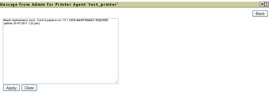 Lets you attach a note about this Printer Agent. When a message exists, this link is highlighted in yellow. To remove the message, you must delete the characters in the message box and then click Apply. This link appears only if you have manager or admin rights to the Printer Agent.