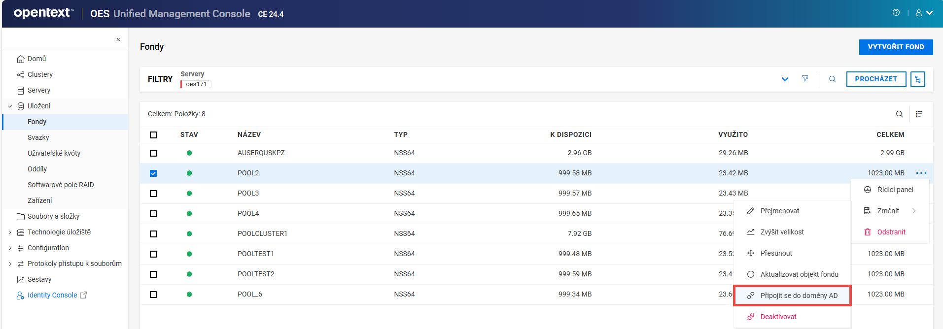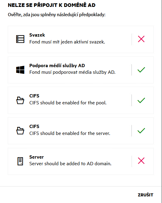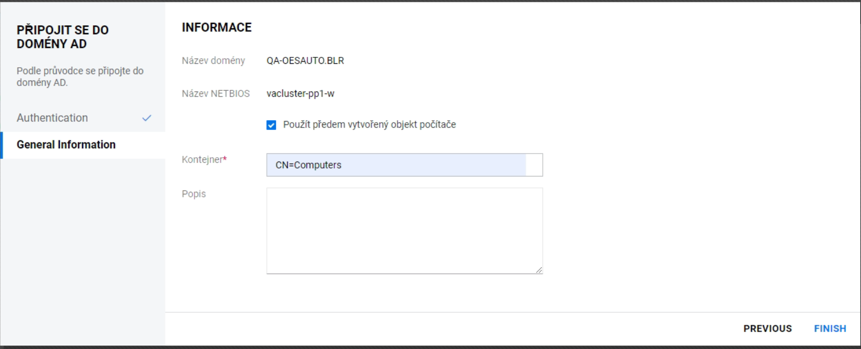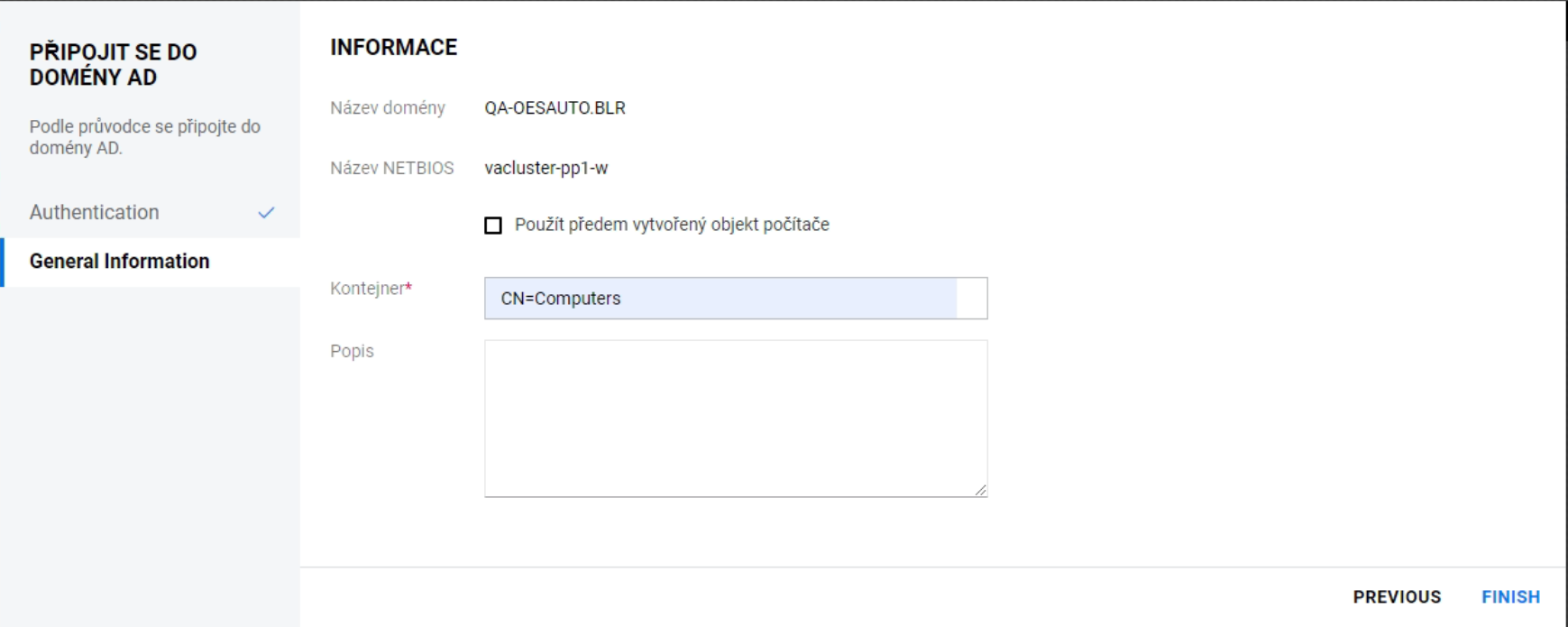 Pokud objekt fondu již existuje, připojení fondu do domény AD se nezdaří. Vymažte objekt ve službě Active Directory a zkuste to znovu.