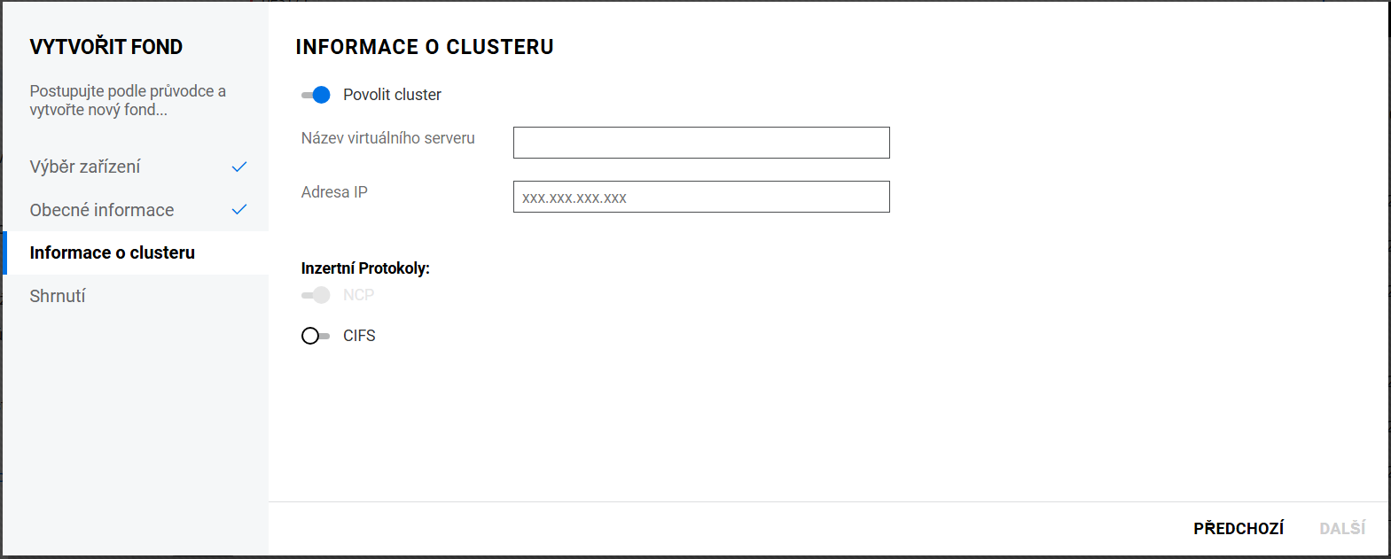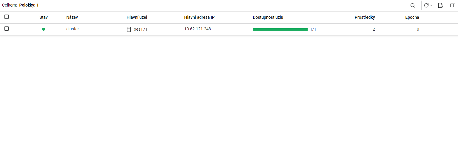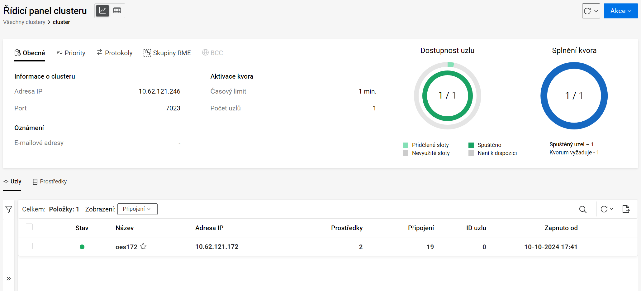 Informace o clusteru: Zobrazuje adresu IP, která je vázaná s hlavním uzlem a zůstává s ním spojena bez ohledu na změny serveru. Výchozí číslo portu clusteru je 7023.