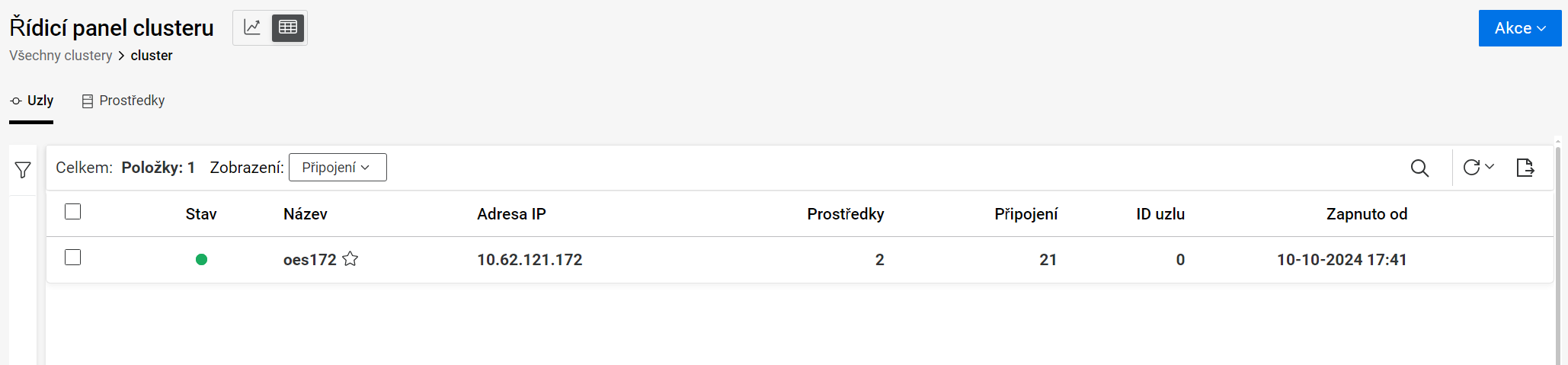 Na kartě Uzly se zobrazí všechny uzly vybraného clusteru. Podrobnosti můžete zobrazit ve dvou různých režimech: Připojení a Výkon.