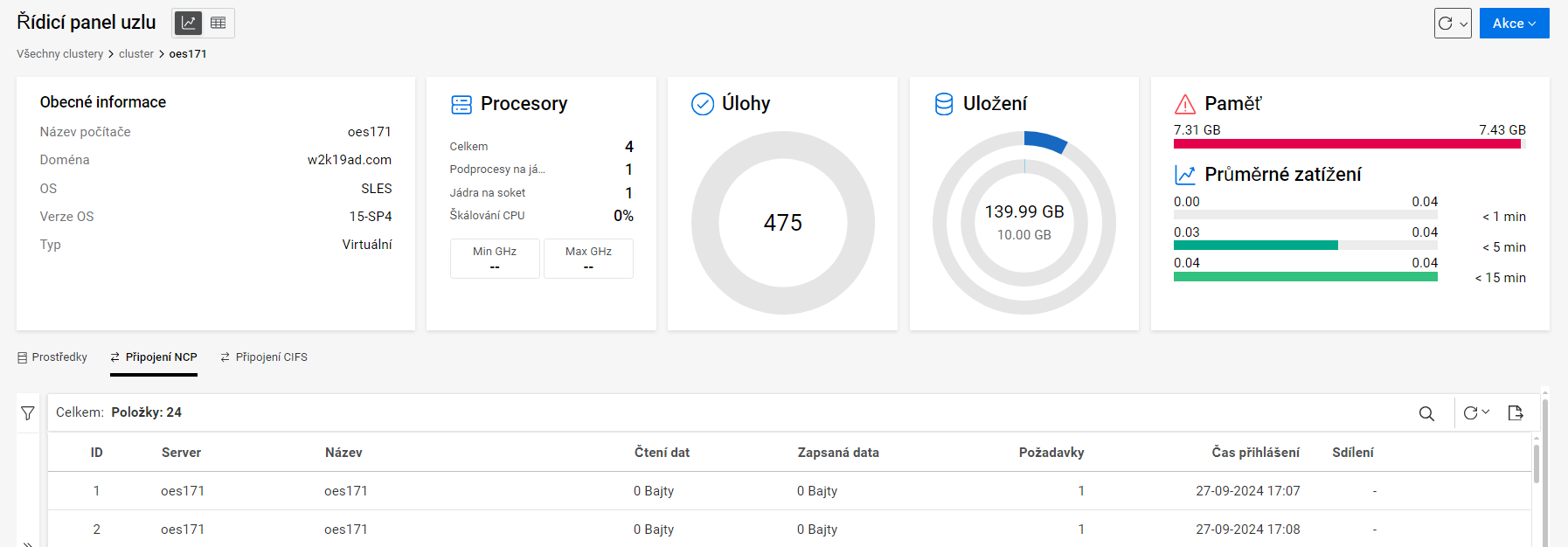 Pokud služba CIFS není v uzlu clusteru dostupná, není konzole UMC schopna načíst připojení v řídicím panelu panelu clusteru. Uzel je zobrazen šedě a prostřednictvím konzole UMC s ním nelze provádět žádné akce.
