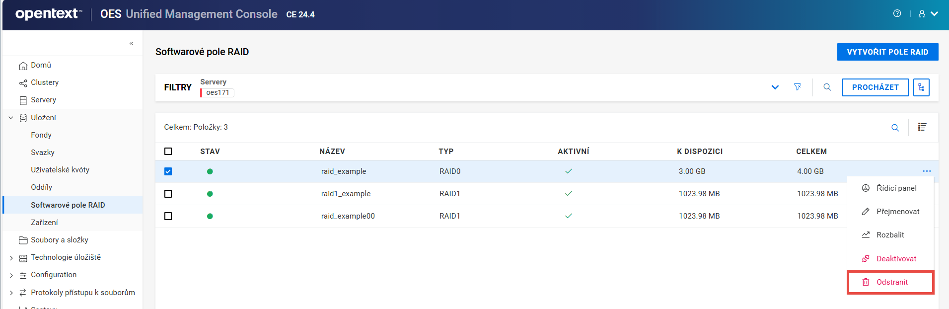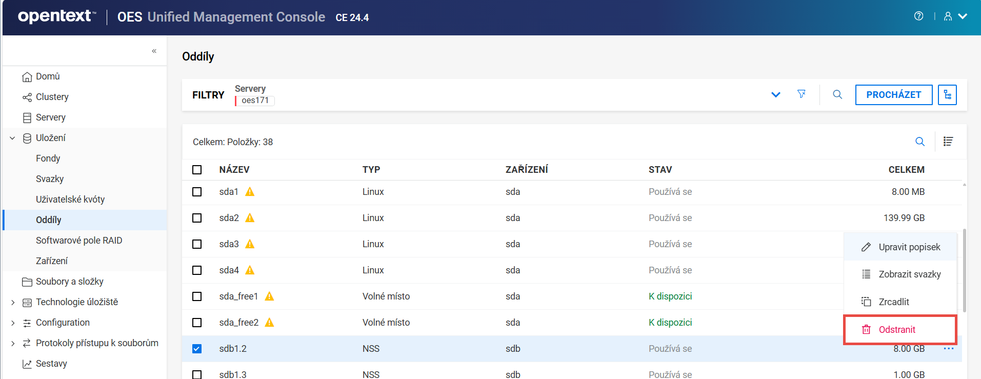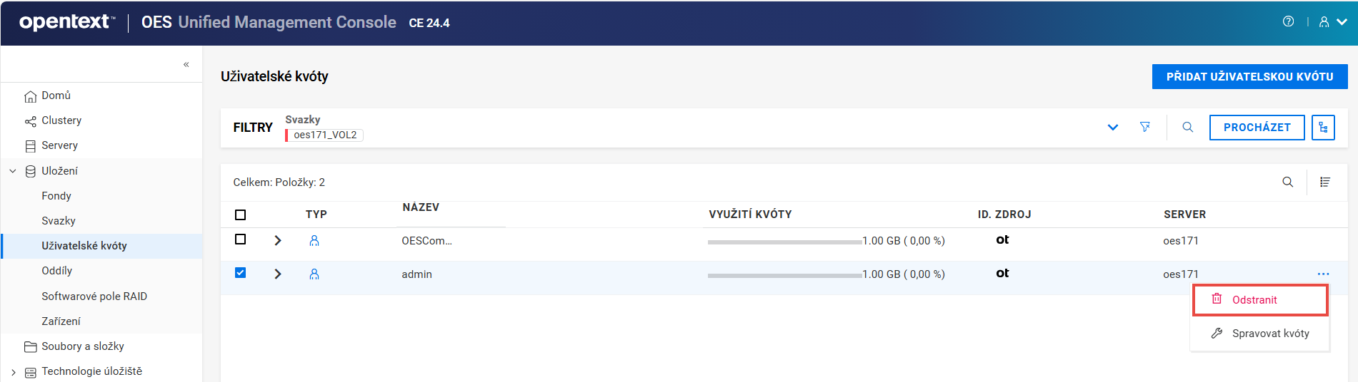 Vyberte uživatelský kontext a klikněte na ikonu Odebrat