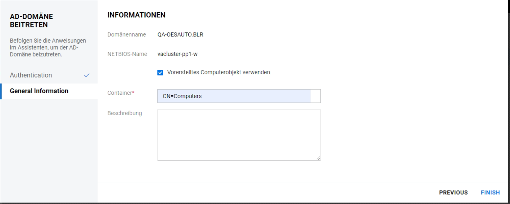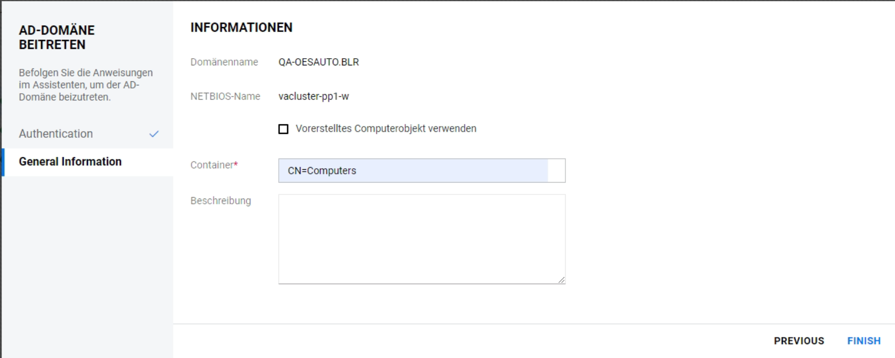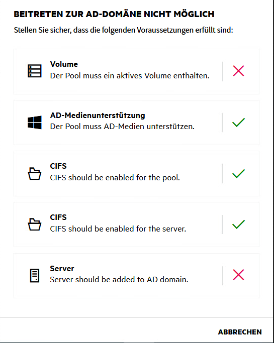 Wenn das Poolobjekt bereits vorhanden ist, schlägt der Beitritt des Pools zu einer AD-Domäne fehl. Bereinigen Sie das Objekt in Active Directory und versuchen Sie es erneut.