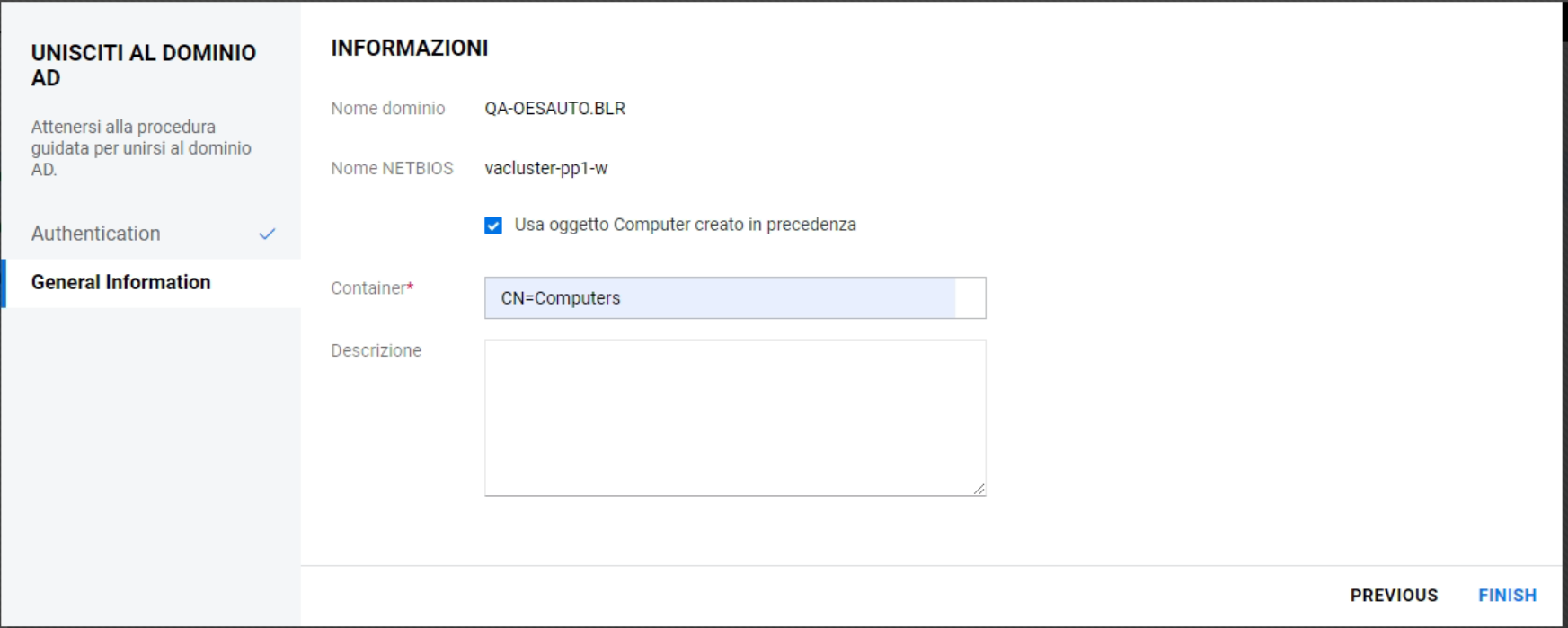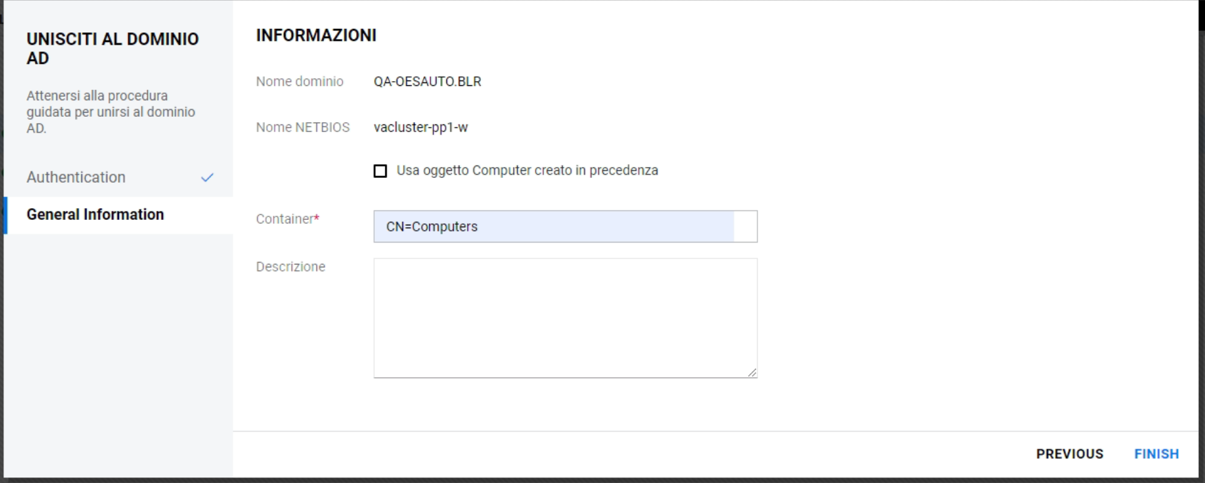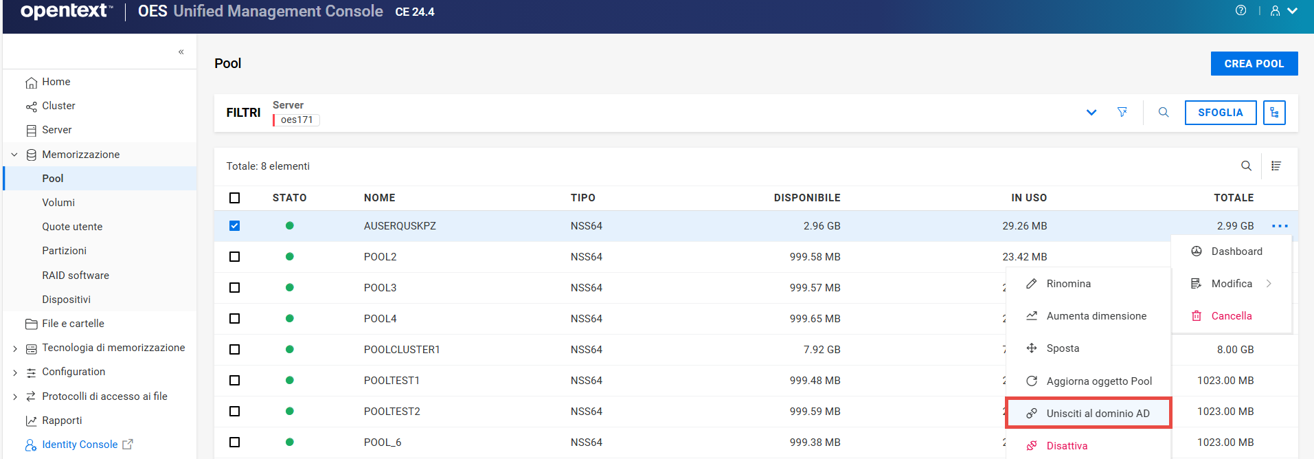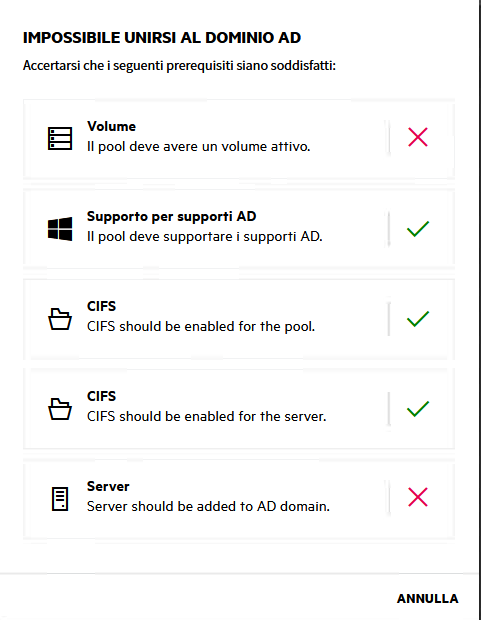 Se l'oggetto Pool esiste già, l'unione del pool a un dominio AD avrà esito negativo. Ripulire l'oggetto in Active Directory e riprovare.
