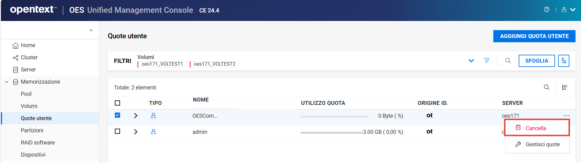 Selezionare un contesto utente e fare clic sull'icona Rimuovi
