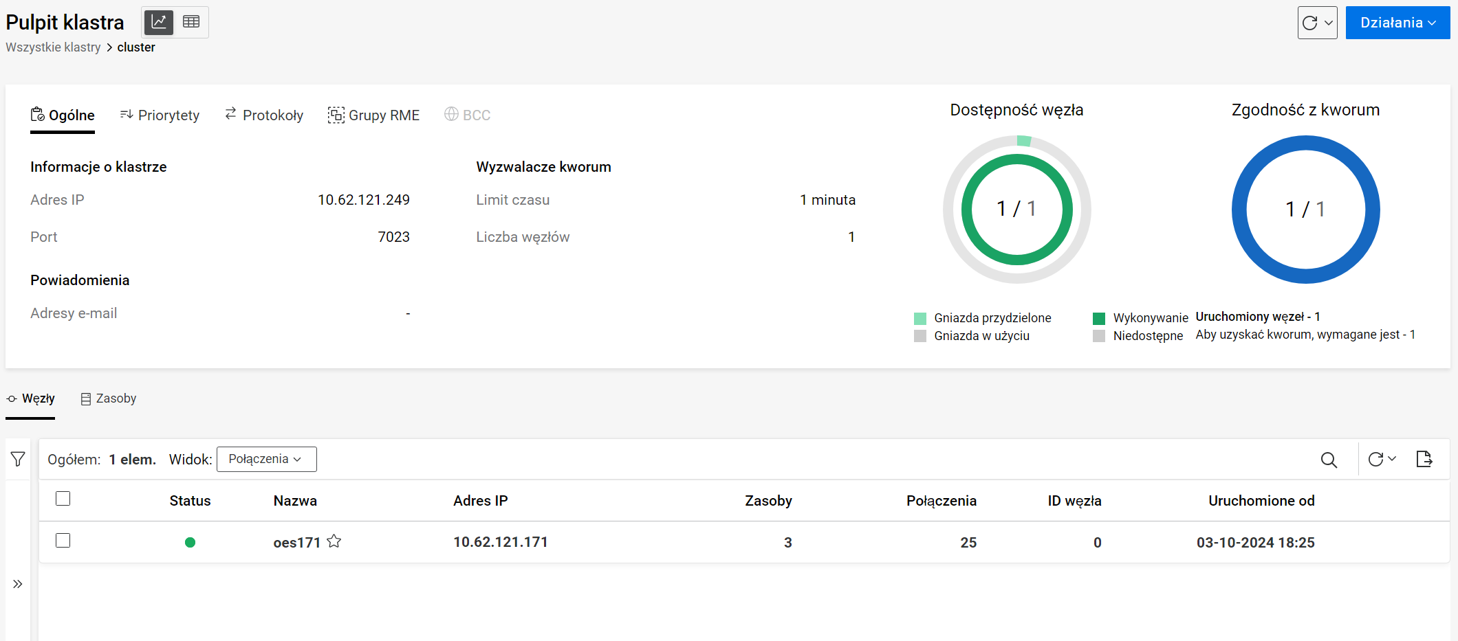 Informacje o klastrze: Wyświetlanie adresu IP powiązanego z węzłem głównym i zachowanie powiązania z tym węzłem niezależnie od zmian serwera. Domyślny numer portu klastra to 7023.