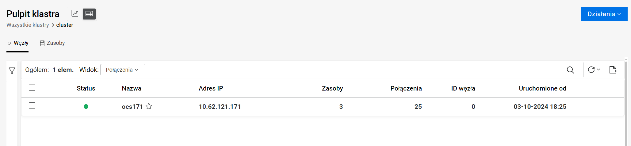 Na karcie Węzły wyświetlane są wszystkie węzły dla wybranego klastra. Szczegóły można wyświetlić w dwóch różnych trybach: Połączenia i Wydajność