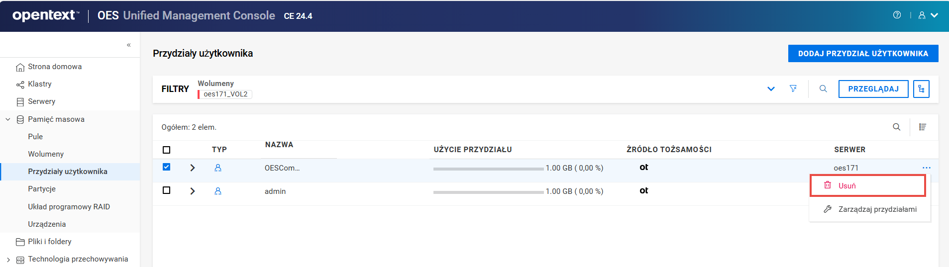 Spowoduje to usunięcie kontekstu użytkownika z listy. Tę akcję można wykonać w przypadku kilku wybranych opcji.