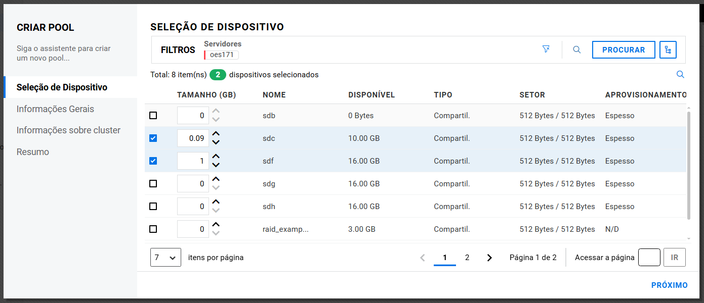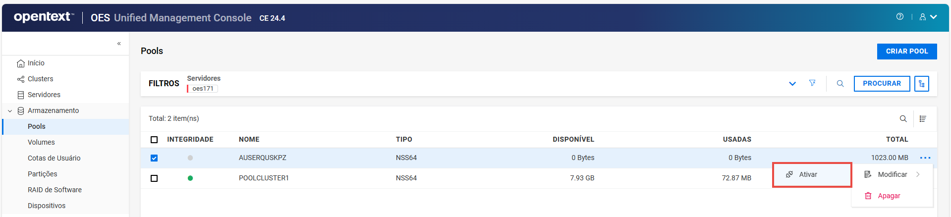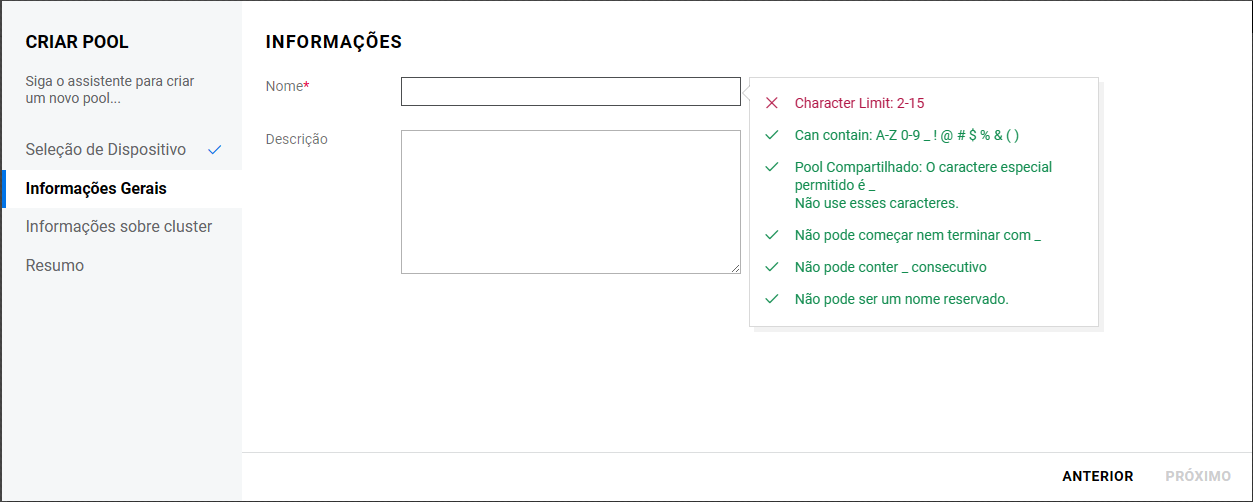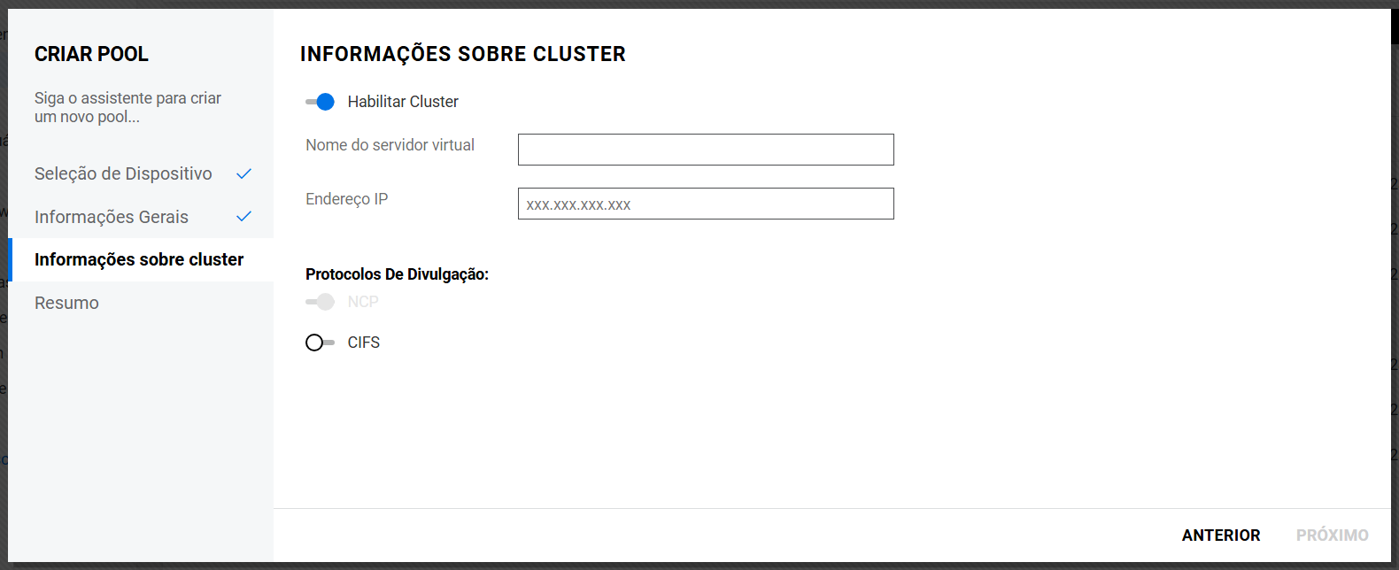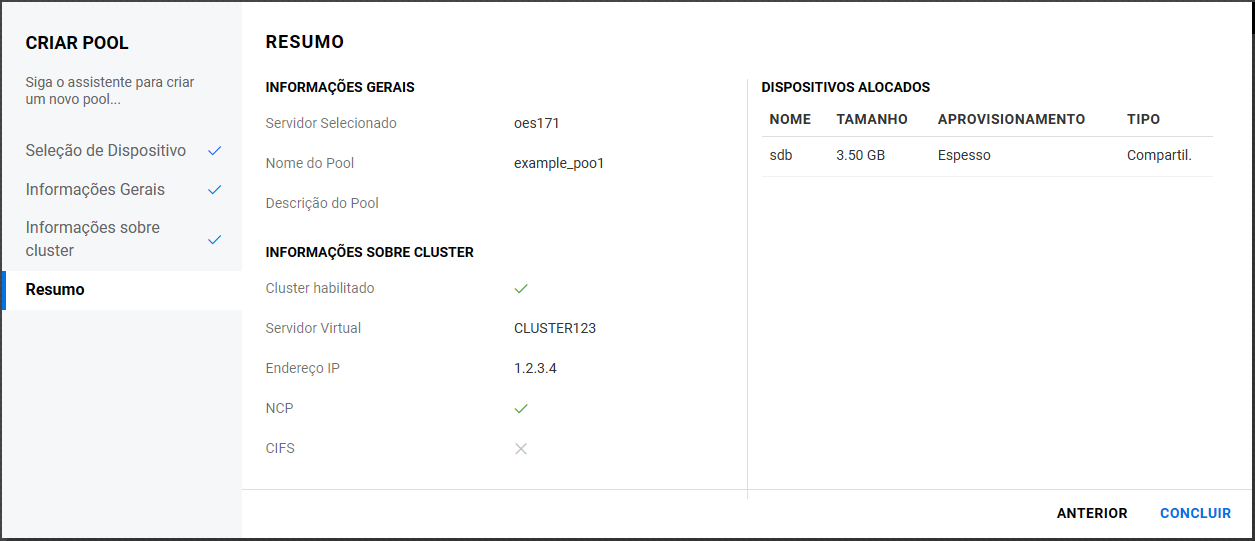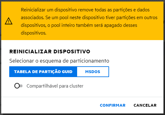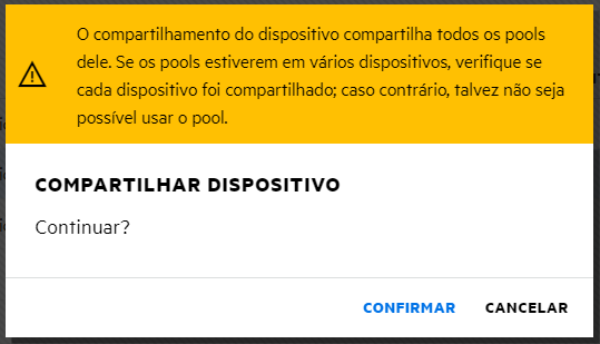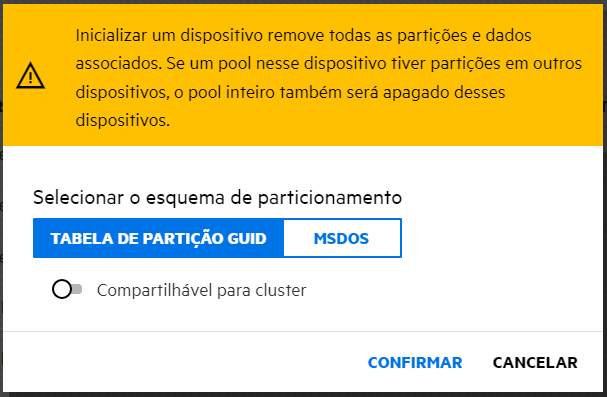 A criação de um pool em um dispositivo compartilhado não será permitida se a configuração não estiver definida para cluster.
