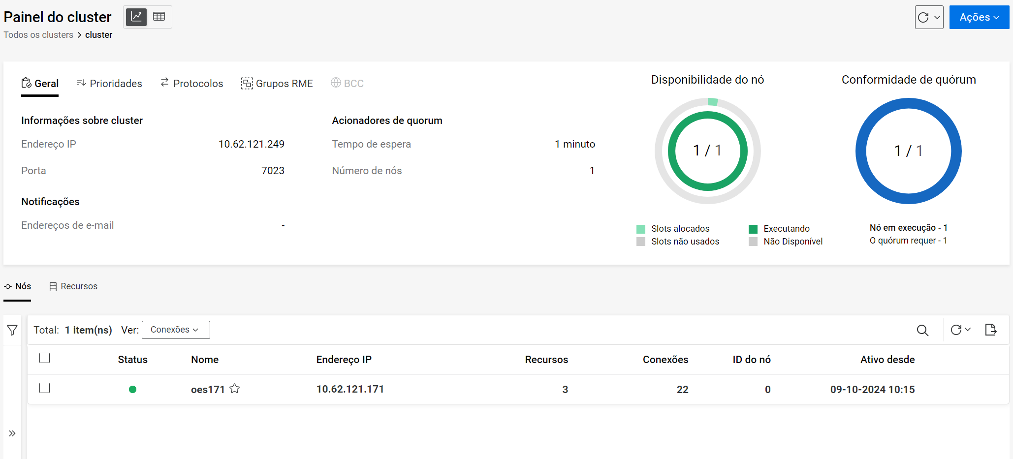 Informações sobre cluster: Exibe o endereço IP vinculado ao nó principal e permanece associado ao nó principal, independentemente de quaisquer alterações no servidor. O número de porta padrão do cluster é 7023.