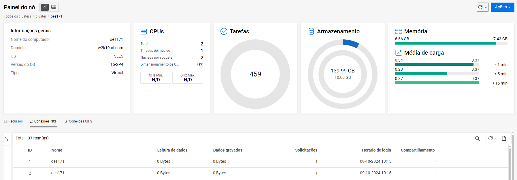 A guia Nós exibe todos os nós do cluster selecionado. Você pode visualizar detalhes em dois modos diferentes: Conexões e Desempenho.