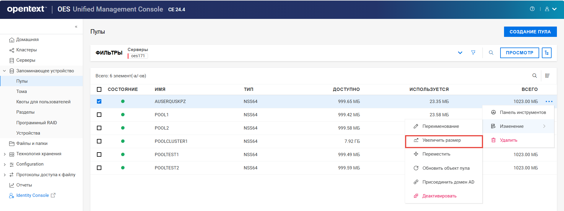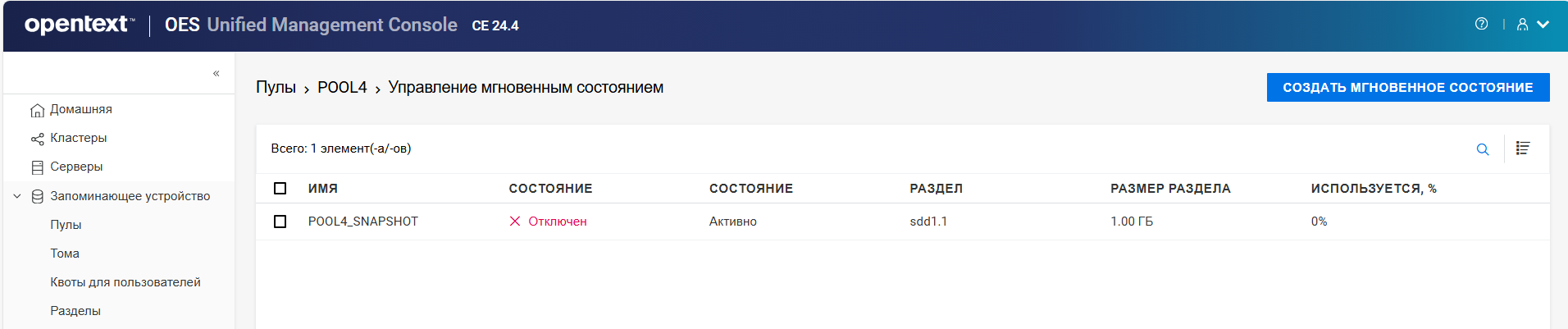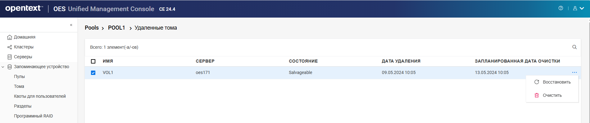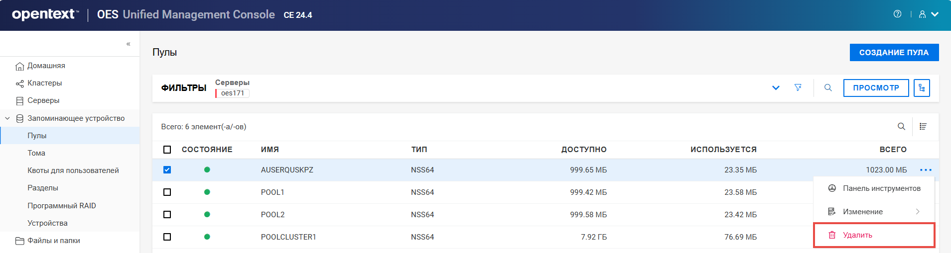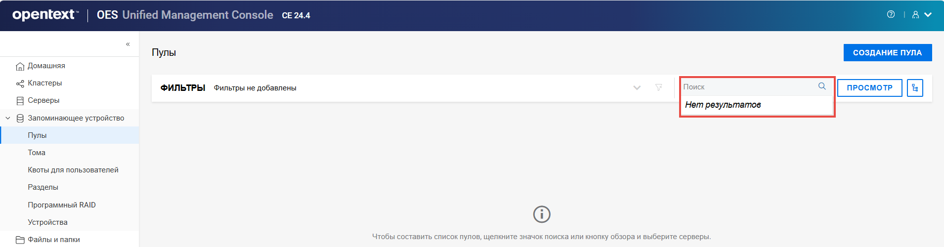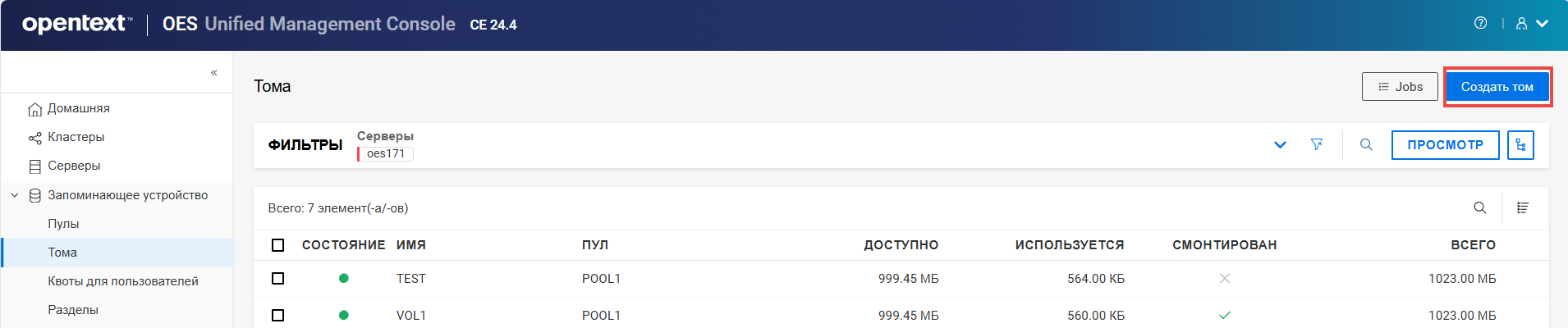 Переименование пула кластера или тома может привести к несогласованному поведению. Если после переименования невозможно вывести пулы или тома, откройте UMC из другого окна в режиме инкогнито.