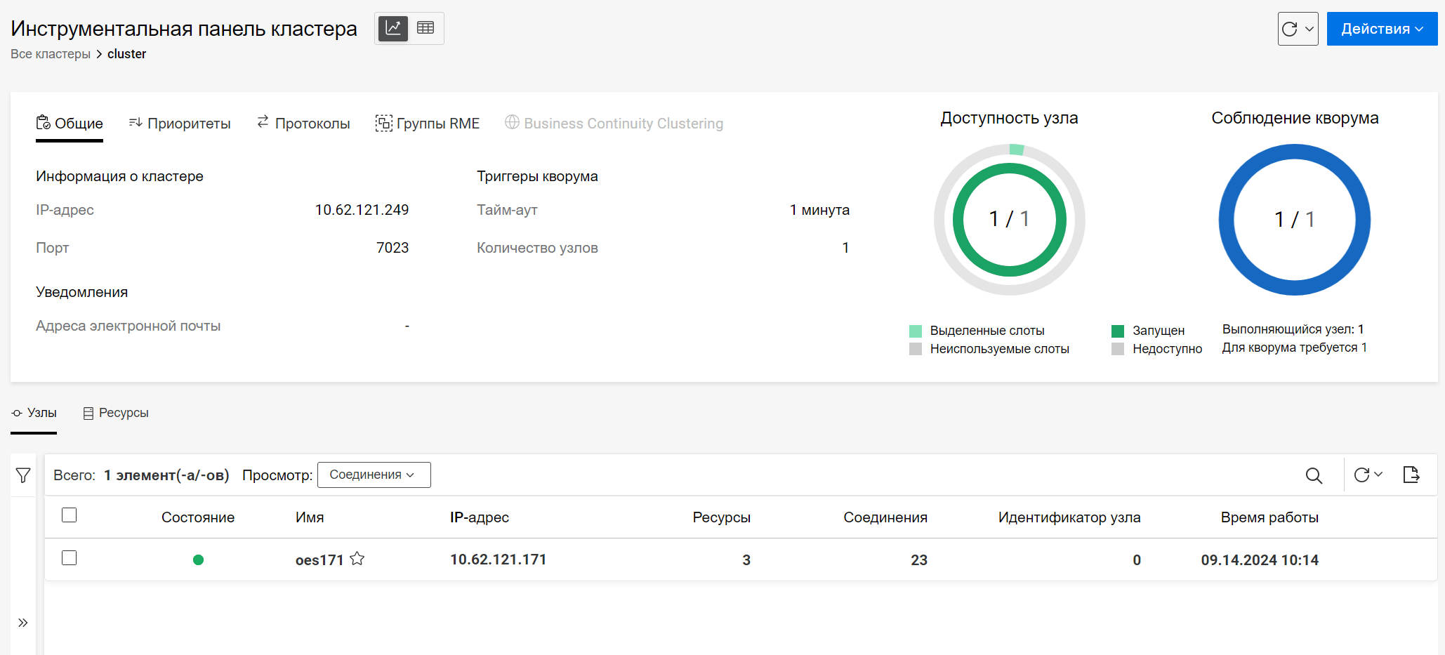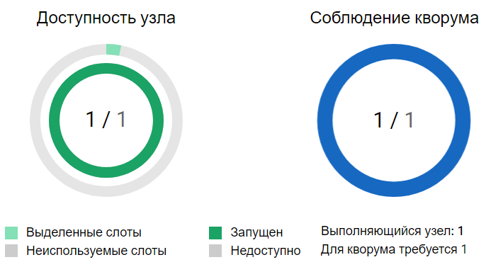 Соблюдение кворума: отображает количество узлов, необходимое для соблюдения кворума, и количество работающих узлов.