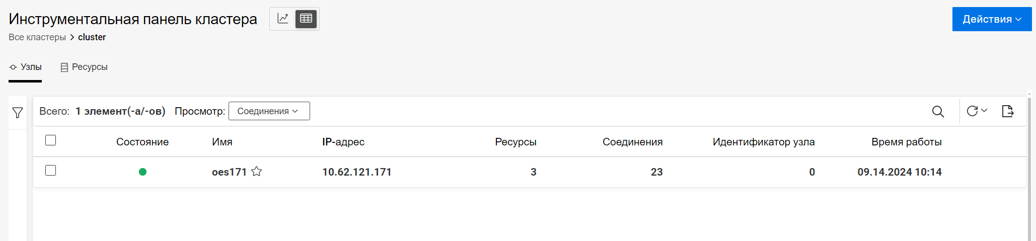 На вкладке Узлы отображаются все узлы для выбранного кластера. Подробная информация доступна для просмотра в двух различных режимах: Соединения и Производительность.