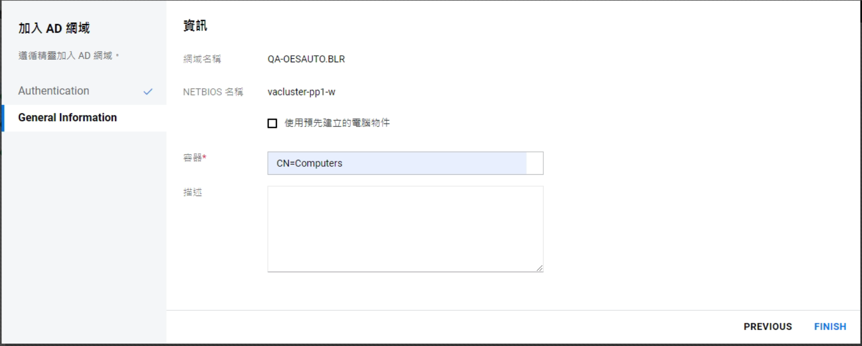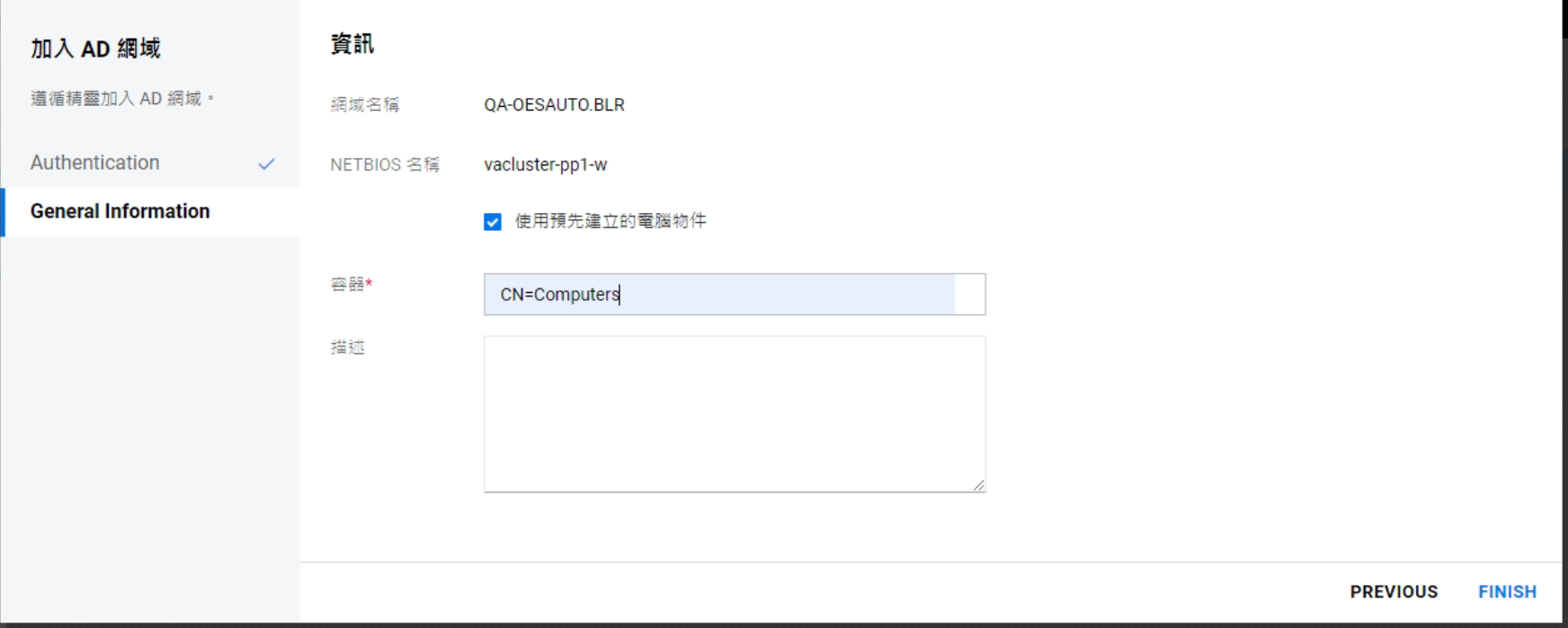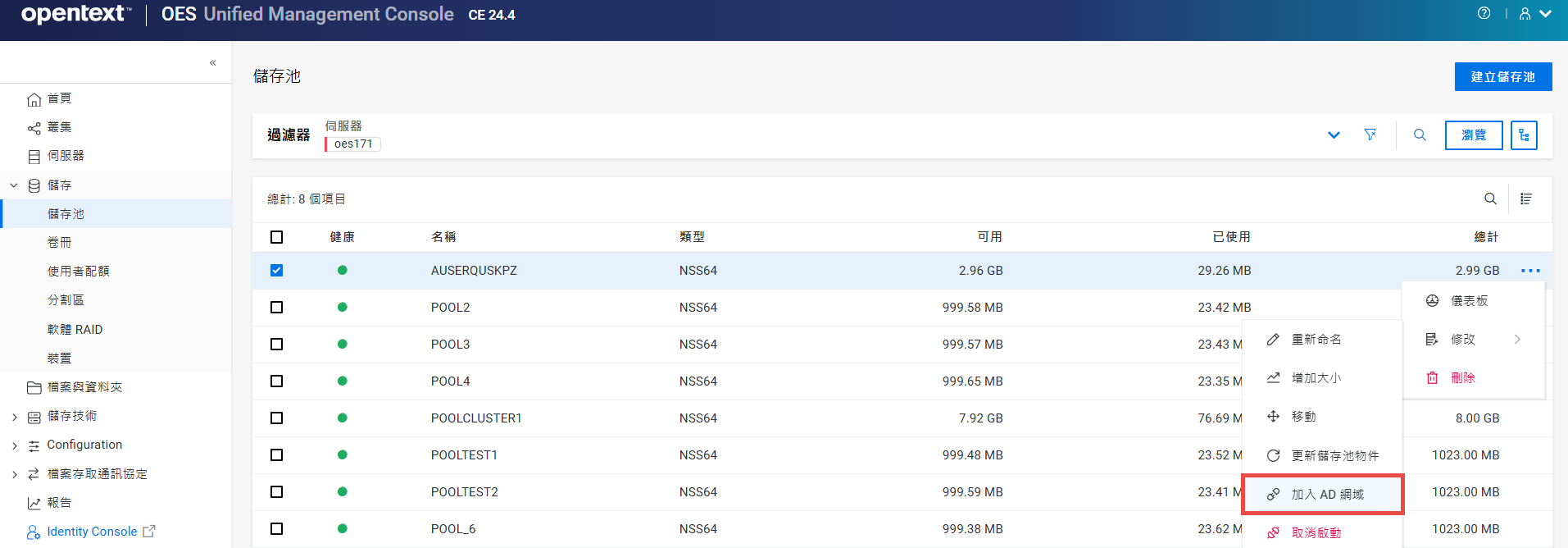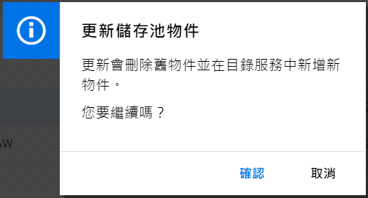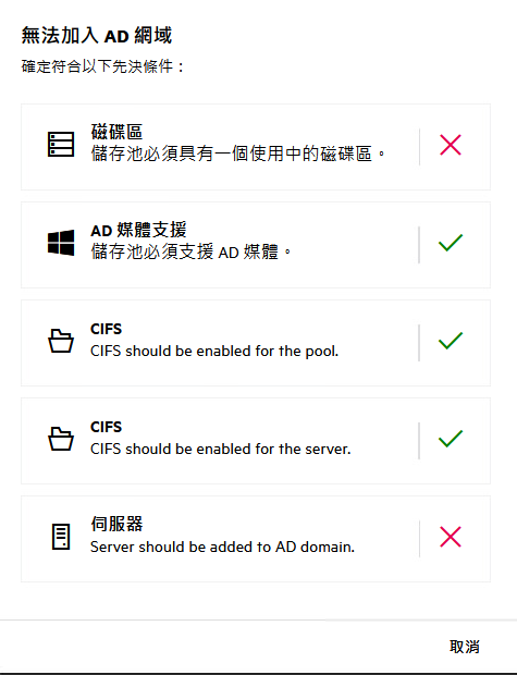 如果儲存池物件已存在,則無法將儲存池加入 AD 網域。請清理使用中目錄的物件,然後重試。