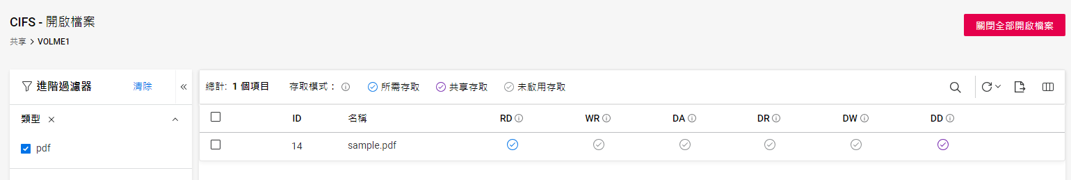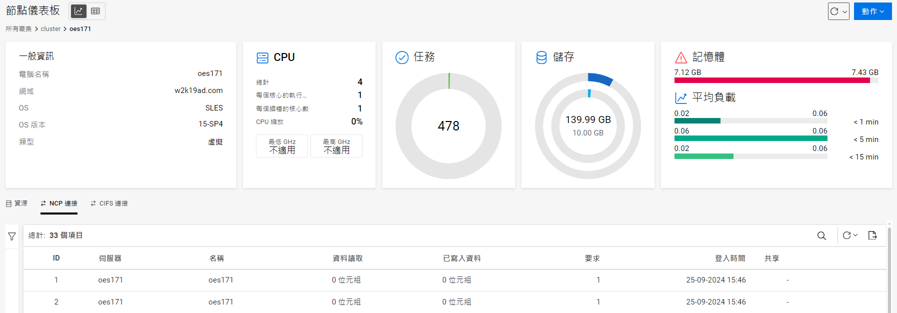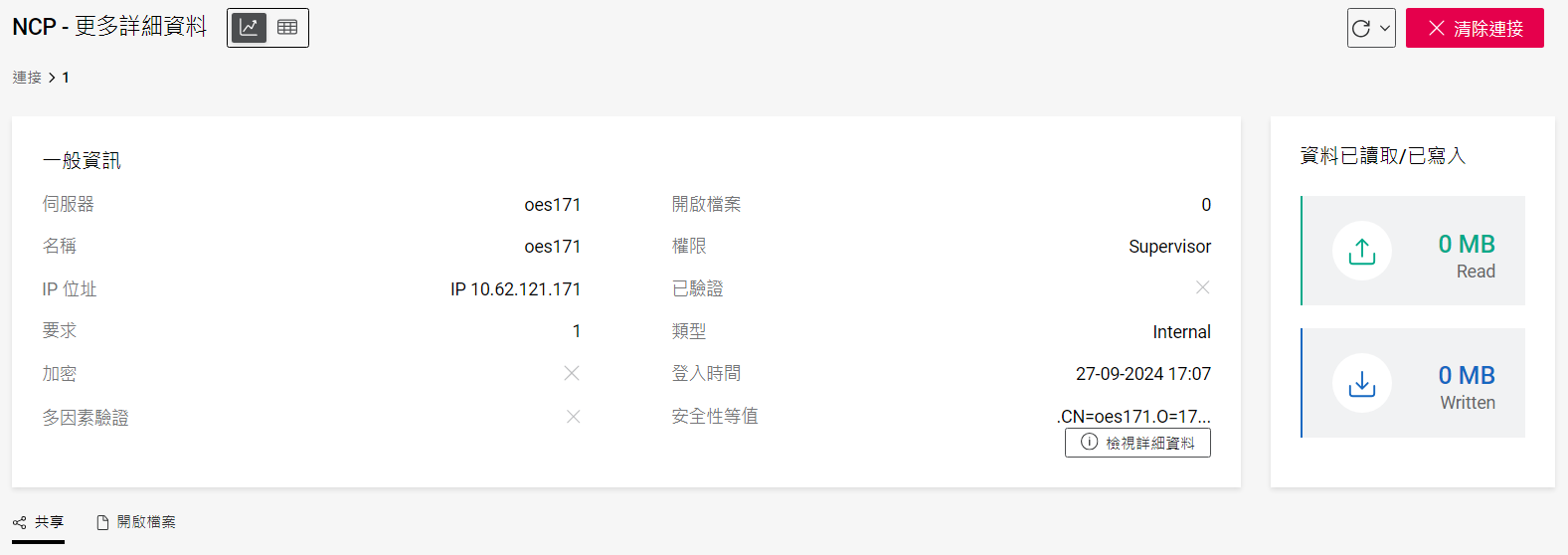 表格檢視: 列出 NCP 和 CIFS 連接。