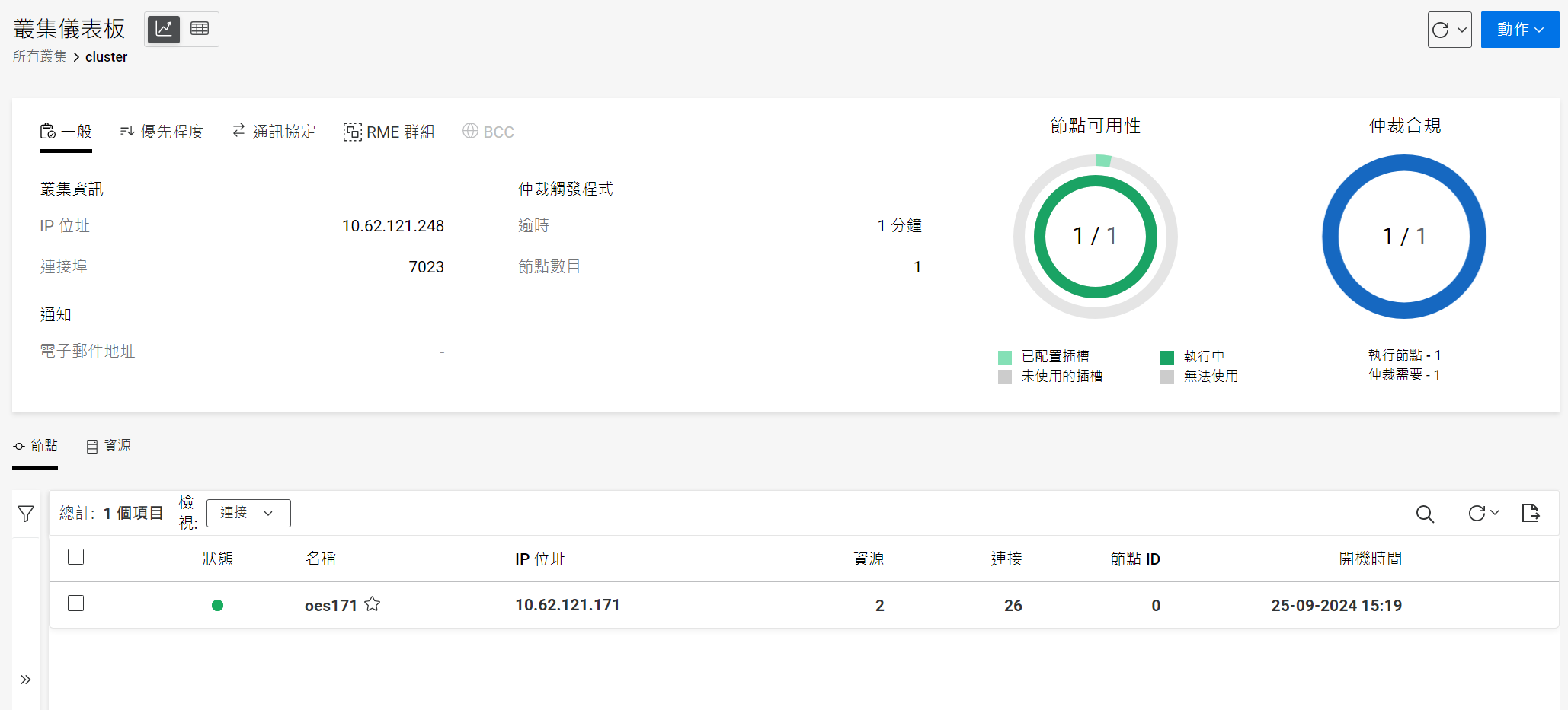叢集資訊: 顯示綁定到主節點的 IP 位址,並與主節點保持關聯,而不受伺服器變更所影響。預設的叢集埠號碼為 7023。