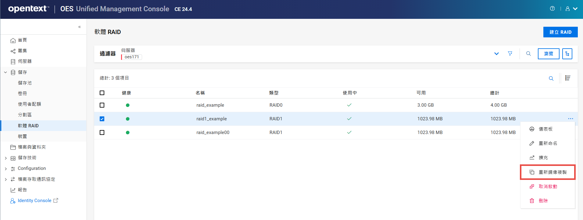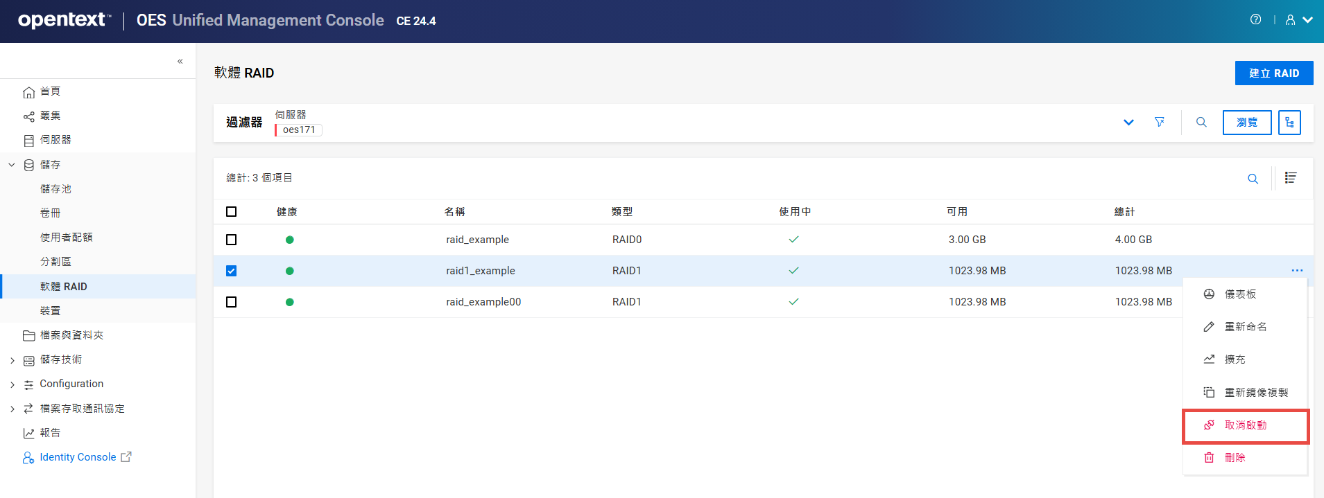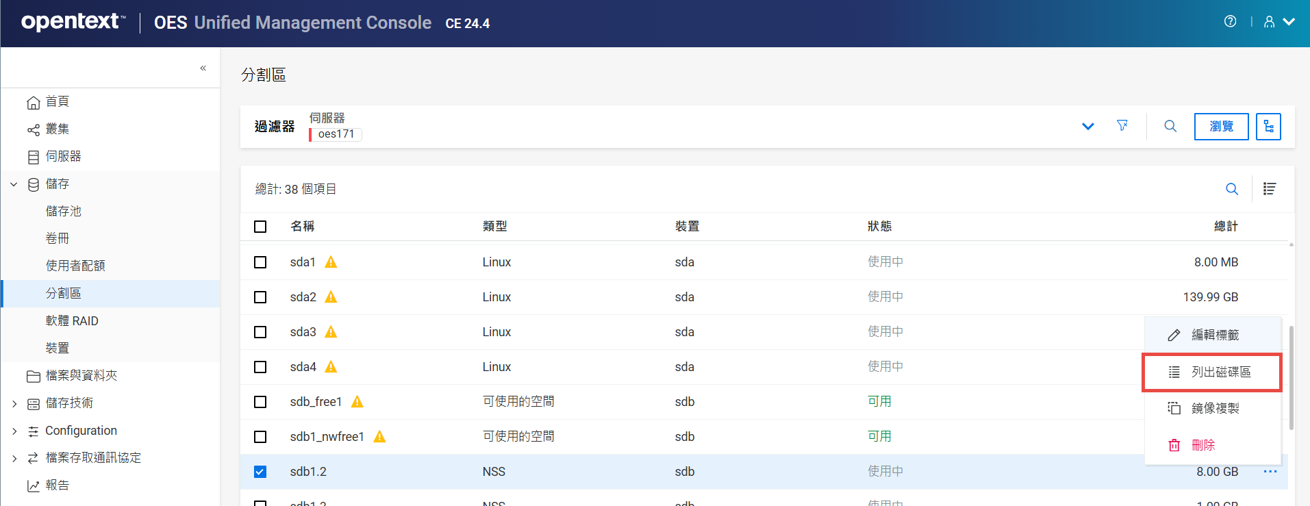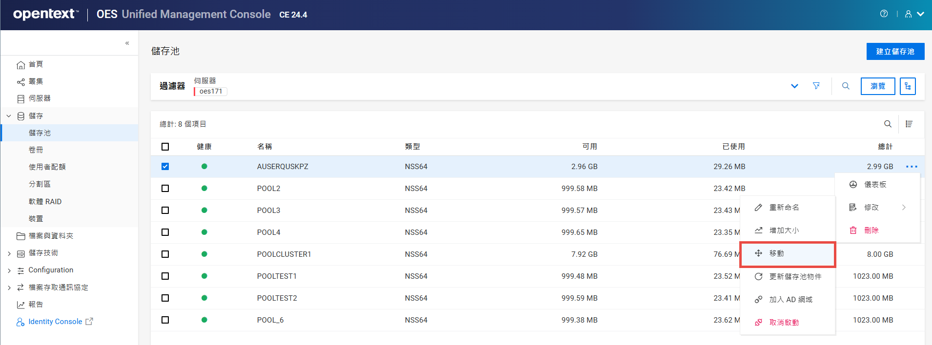 列出資源,其中包括讓資源上線、讓資源離線和移轉資源等動作。