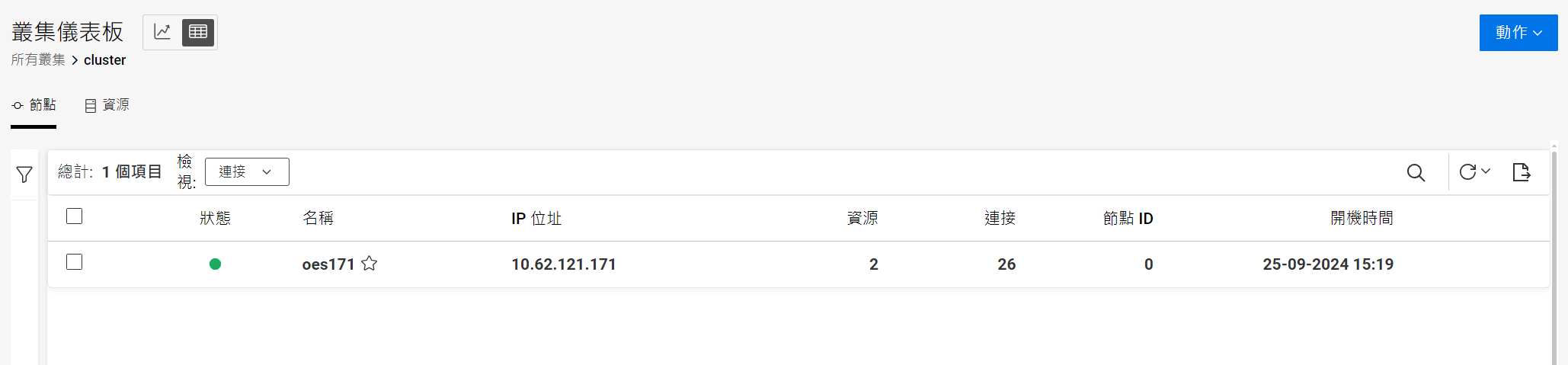 :顯示儀表板、節點和資源。