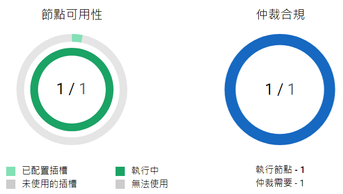 節點可用性: 外部圖形指出總共 32 個節點中正在使用的節點數,內部圖形則顯示可用節點數和不健康的節點數。