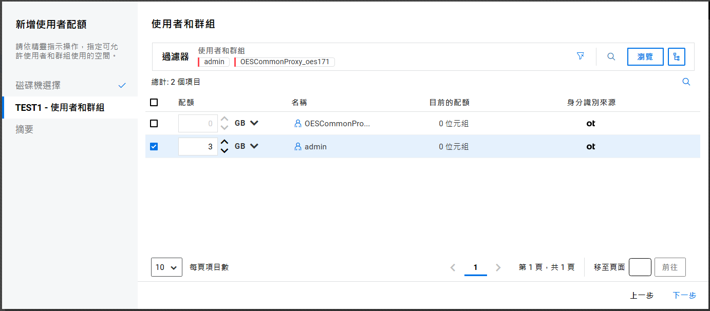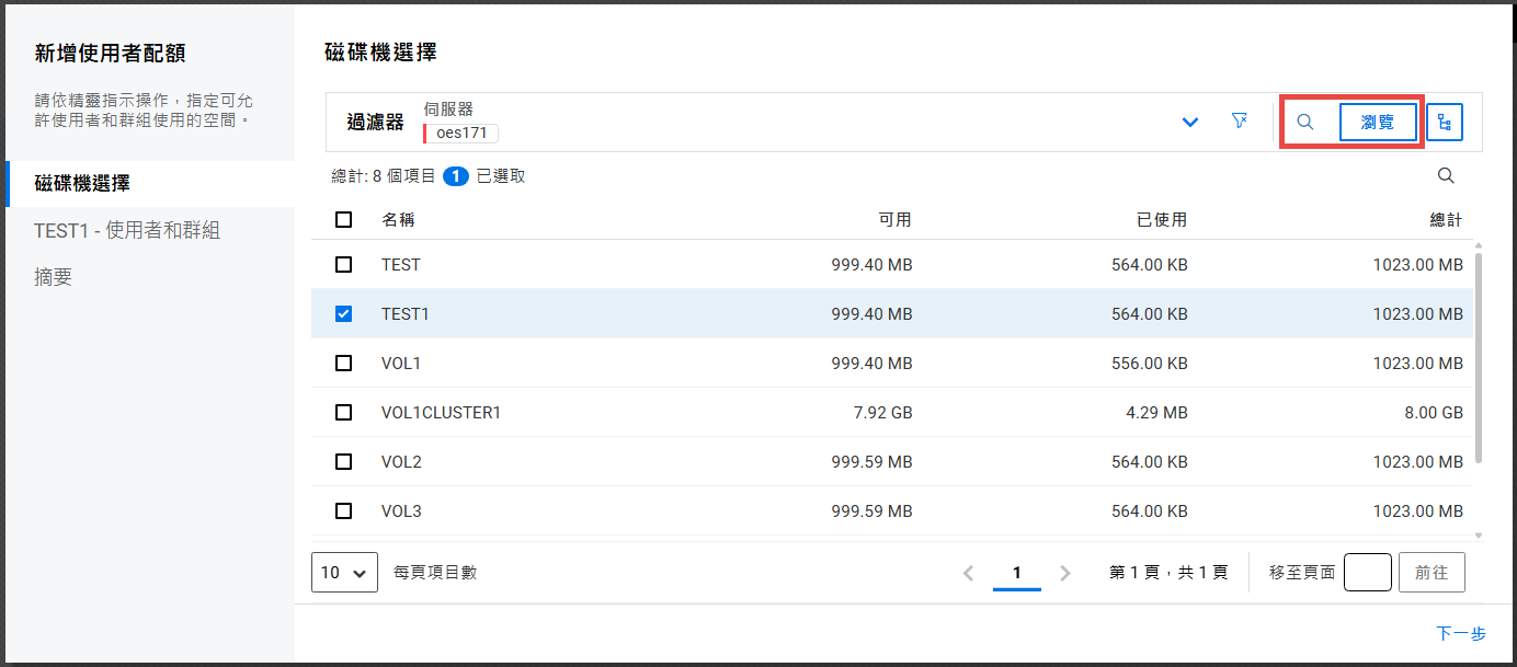 在「容器」頁面上,瀏覽伺服器以選取容器,然後按「下一步」。