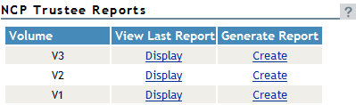 Under Manage NCP Services, the View Trustee Reports option opens the NCP Trustee Reports page where you can generate a trustee report for a specified NSS volume. This includes Dynamic Storage Technology shadow volumes that are comprised of two NSS volumes. You can display the last trustee report in the web browser. A trustee report shows the rights settings by folder for each user or group that is a trustee on the NSS volume.
