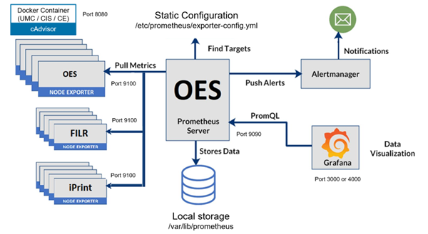 Install Prometheus on one OES 2023 or SLES 15 SP4 server which acts as the Prometheus server and install node exporter on the OES Server or iPrint Appliance to be monitored for collecting statistics like CPU, memory, and disk space utilization. Only when monitoring docker containers (CIS or UMC) cAdvisor is required.