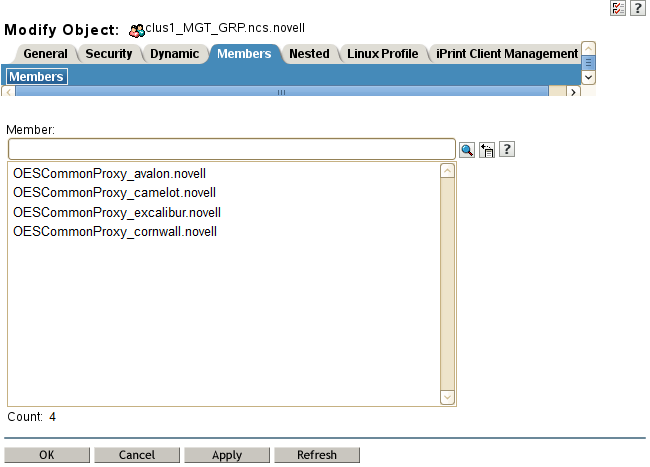 The specified NCS Proxy User for the node is automatically assigned as a member in the <cluster_name>_MGT_GRP.<context> group that resides in the Cluster object container, such as clus1_MGT_GRP.ncs.novell. The group accommodates the server-specific NCS Proxy Users that you assign when you configure each node for the cluster. Members are added to the group as you configure each node for a cluster. Each member of the group has the necessary rights for configuring the cluster and cluster resources and for exchanging information with eDirectory.