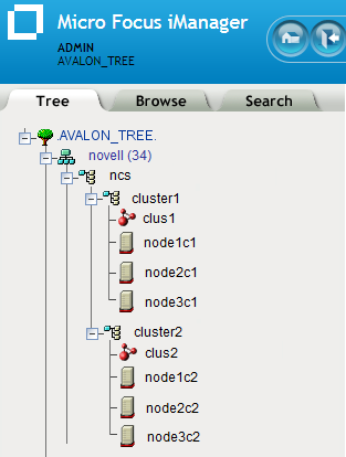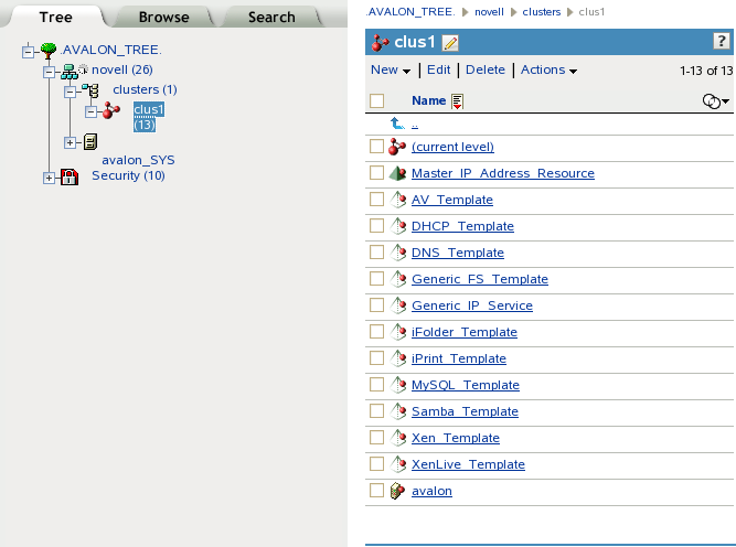 For example, Figure 8-4 shows the 13 default eDirectory objects that are created in the Cluster container as viewed from the Tree view in iManager: