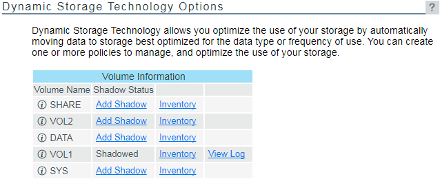 The volume is the primary volume in a DST shadow volume. To identify the secondary storage area for this volume, click the Information icon next to the volume name to go to the Share Information page, then view the File System Shadow Path. |