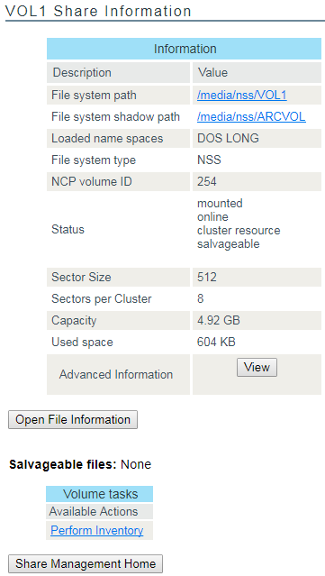 The Share Information page displays details about the NCP volume, such as its Linux file system path, the file system path of its shadow area (if it is shadowed), the file system type, and capacity.