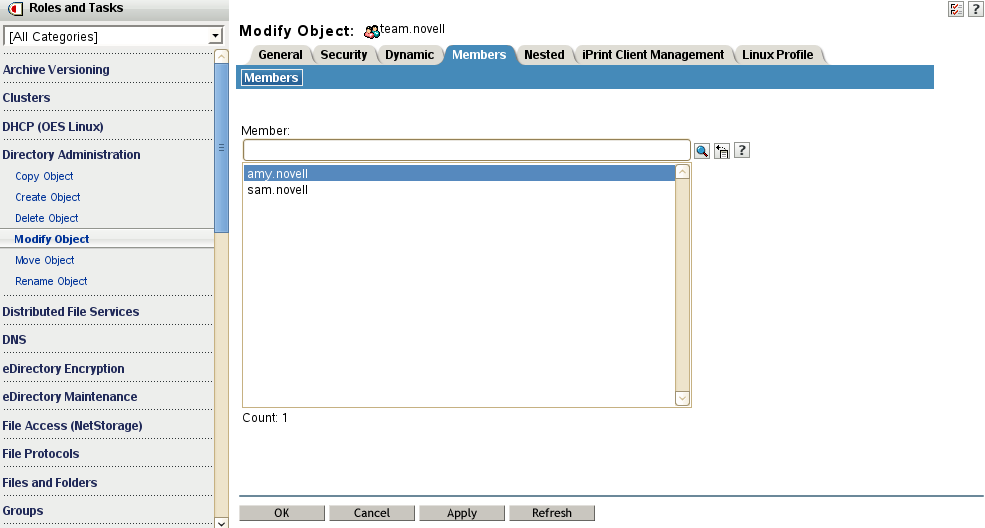 For example, in iManager, you can use the Directory Administration > Modify Object option to add the User object named sam as a member of the Group object named team, as shown in Figure 5-4. The team object is automatically added to the Security Equal To property for sam, as shown in Figure 5-4. All members of the Group object, including sam, effectively have the same rights to the file system tree as those explicitly assigned to team.