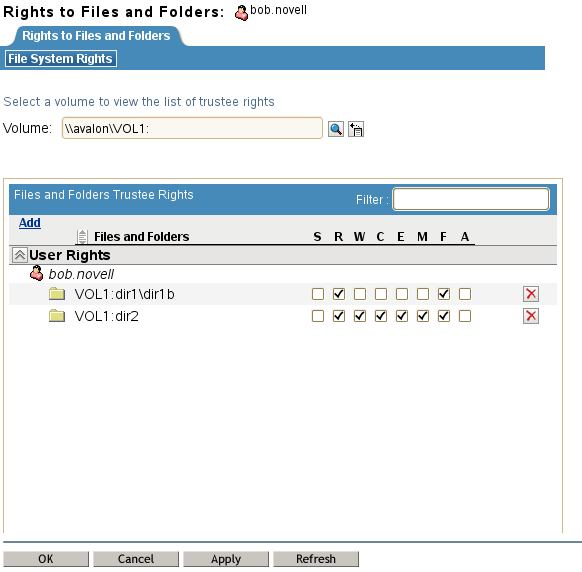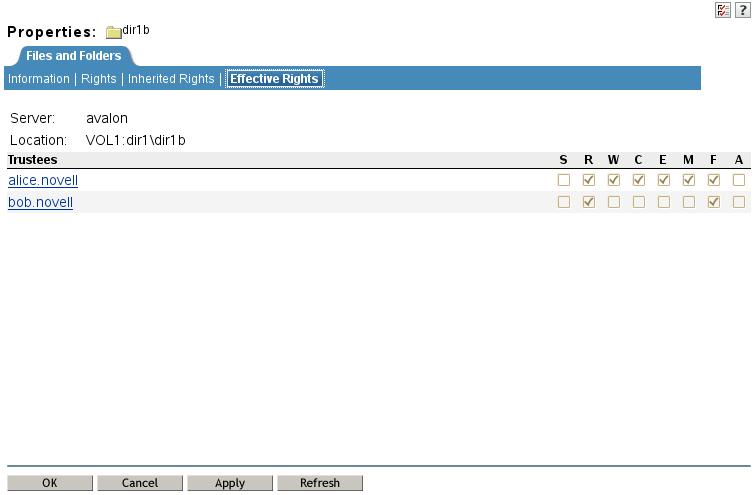 Click the Effective Rights tab to view the list of trustees and their effective rights on the chosen folder or file.