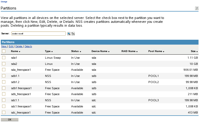 The Partitions page in iManager reports the partitions that it finds on a selected server, and displays information about them.