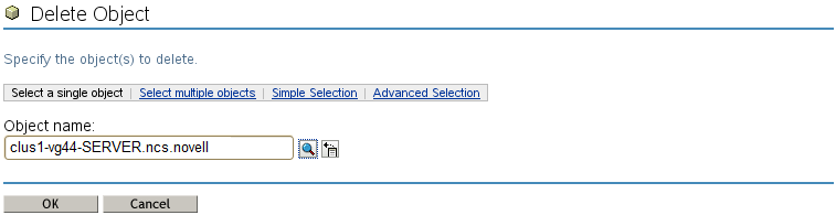 On the Delete Object page, browse to locate and select the resource’s NCS:NCP Server object (such as clus1-vg44-SERVER.ncs.novell), then click OK.