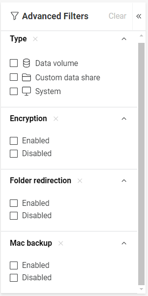 Folder redirection - CIFS shares can be filtered based on the folder redirection enabled or disabled state.
