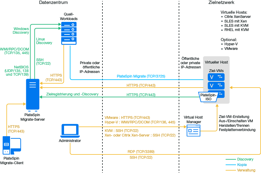 HINWEIS:Abbildung 17-1 zeigt die automatisierte Ermittlung und die Netzwerkanforderungen für Windows- und Linux-Workloads. Alternativ können Sie den Workload mit dem Migrate Agent auf dem Ursprungs-Workload registrieren und seine Inventardetails per HTTPS (TCP/443) an den PlateSpin Migrate-Server senden. Weitere Informationen hierzu finden Sie unter Abschnitt 2.6.2, Voraussetzungen für die Workload-Registrierung und Abschnitt 22.7, Registrieren von Workloads und Ermitteln der Details im Migrate Agent.