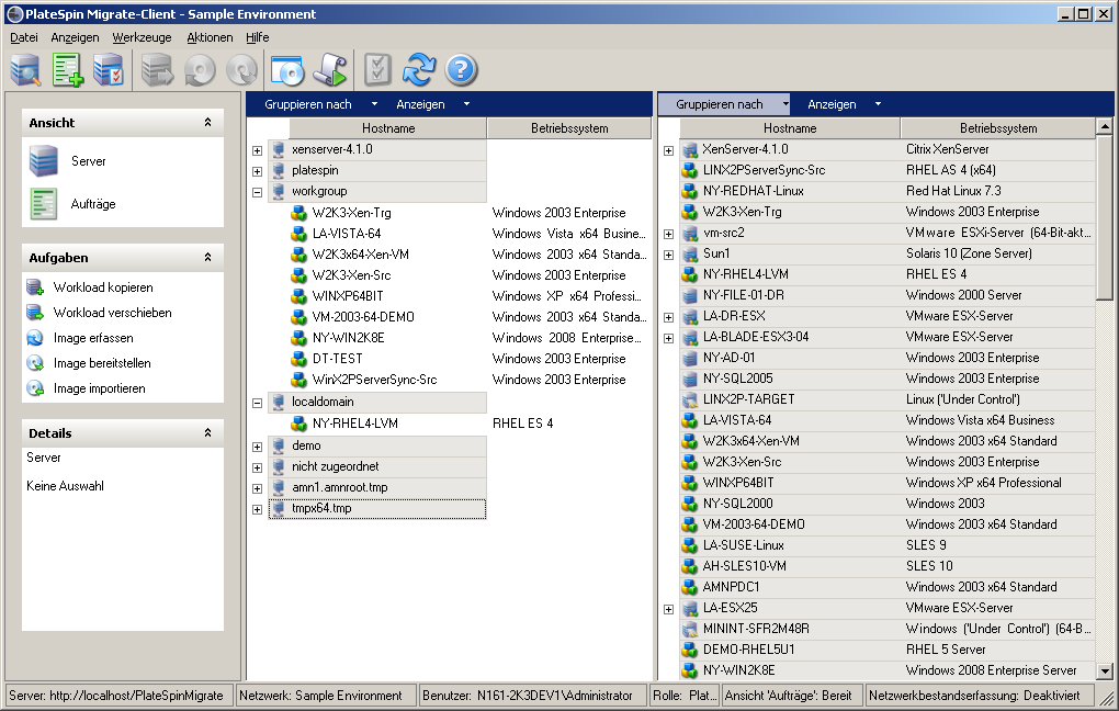 Mit dem Verwaltungswerkzeug im PlateSpin Migrate-Client verwalten Sie die Migration zu verschiedenen virtuellen Hostzielen, physischen Zielen, PlateSpin-Imageserver-Zielen sowie die Serversynchronisierung.