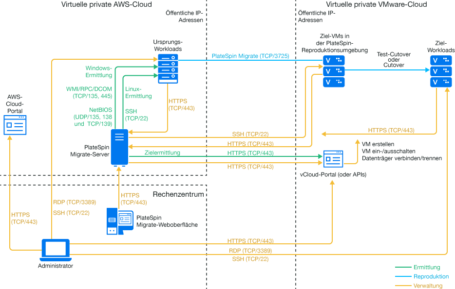 Migrate Agent ist nicht erforderlich, weil ein VPN verfügbar ist, kann aber dennoch verwendet werden. Informationen zu den Anforderungen an Netzwerkports und Firewalls für die Registrierung finden Sie unter Abschnitt 2.6.2, Voraussetzungen für die Workload-Registrierung.