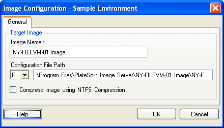 Configuración de la imagen: especifique el nombre de la imagen, la vía a la ubicación en la que se debe almacenar la imagen y si se debe usar la compresión NTFS (en Image Configuration [Configuración de la imagen], haga clic en General).