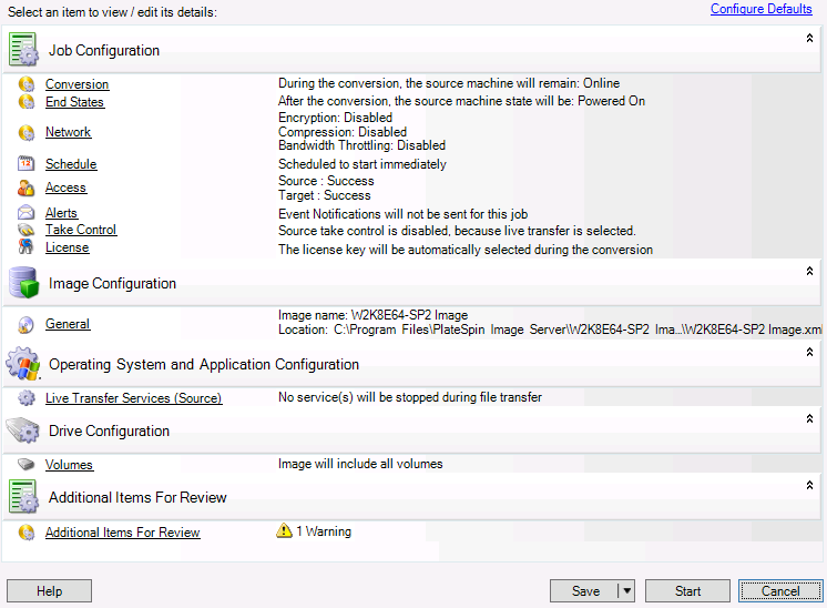 Para especificar la configuración necesaria para el trabajo de migración, haga clic en los enlaces de cada categoría: