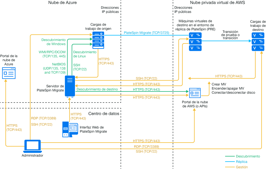 Distribuya el servidor de PlateSpin Migrate desde Azure Marketplace en el entorno de Azure de origen. La imagen del servidor de Migrate en Azure Marketplace está preconfigurada para que admita su entorno de IaaS de Azure del host: Azure global o Azure China independiente. Si el servidor de Migrate y las cargas de trabajo de origen se encuentran en el mismo grupo de seguridad de red, puede utilizar el descubrimiento de Migrate para añadir los detalles de la carga de trabajo a Migrate. La Figura 12-2 muestra la ubicación de varios componentes en los entornos de AWS, Azure y de migración del centro de datos, así como las comunicaciones existentes entre ellos.