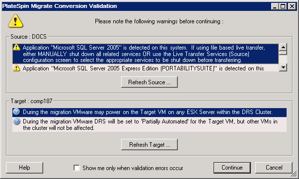 En una configuración de PlateSpin Migrate por defecto, los mensajes de validación se muestran en la parte inferior de la ventana Action (Acción). Sin embargo, si ha configurado PlateSpin Migrate para que omita la ventana Action (Acción) al arrastrar y soltar, los errores y advertencias se muestran en una ventana independiente: