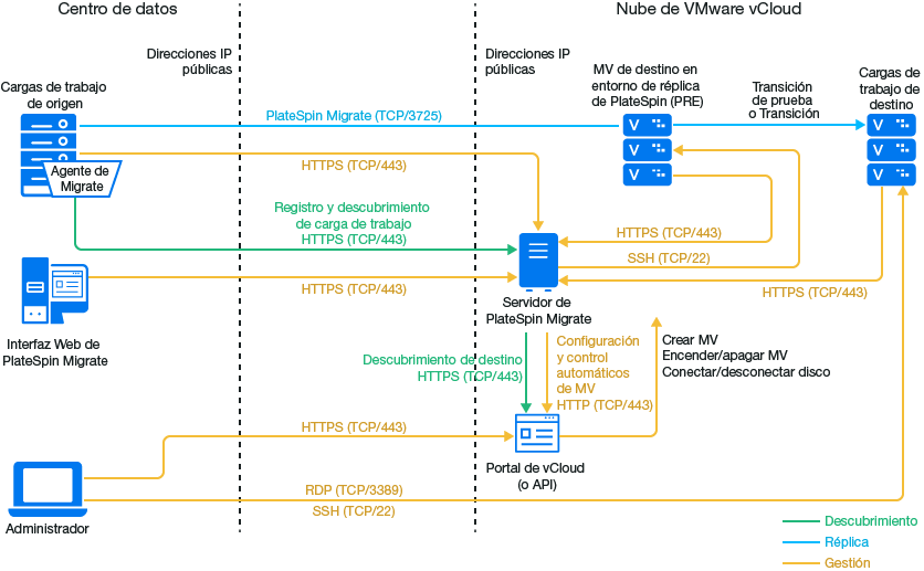 El servidor de PlateSpin Migrate está disponible para una distribución del servidor de Migrate basada en la nube. La Figura 10-2 muestra la ubicación de varios componentes en el entorno de migración de vCloud, así como las comunicaciones entre ellos. Consulte Sección 10.2, Planificación para migrar cargas de trabajo a VMware vCloud Director.