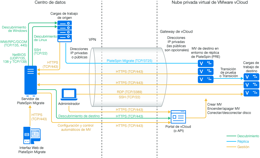 NOTA:la Figura 10-1 muestra el descubrimiento automatizado y los requisitos de red de las cargas de trabajo Windows y Linux. Opcionalmente, puede usar el agente de Migrate en la carga de trabajo de origen para registrar la carga de trabajo y enviar sus datos de inventario al servidor de PlateSpin Migrate mediante HTTPS (TCP/443). Consulte Sección 2.6.2, Requisitos para el registro de la carga de trabajo y Sección 22.7, Registro de cargas de trabajo y descubrimiento de detalles con el agente de Mígrate.