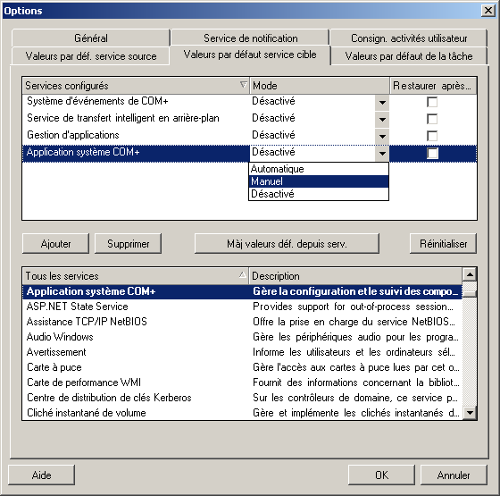 Le client PlateSpin Migrate vous permet de sélectionner les services Windows dont le mode sur la cible doit être différent de celui de la source. Reportez-vous à la rubrique États des services sur les workloads Windows cibles.