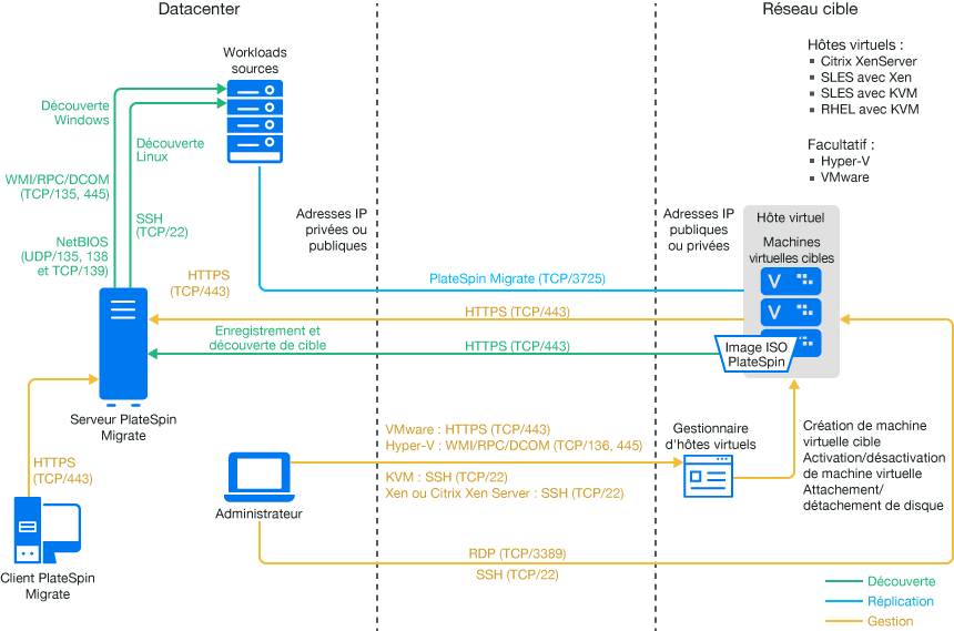 REMARQUE :la Figure 13-1 et la Figure 13-2 représentent une découverte automatisée et les exigences réseau pour les workloads Windows et Linux. Vous pouvez également utiliser l'agent Migrate sur le workload source pour enregistrer le workload et envoyer les détails de son inventaire au serveur PlateSpin Migrate à l'aide de HTTPS (TCP/443). Reportez-vous aux sections Section 2.6.2, Conditions requises pour l'enregistrement de workloads et Section 22.7, Enregistrement de workloads et de découverte des détails avec l'agent Migrate.